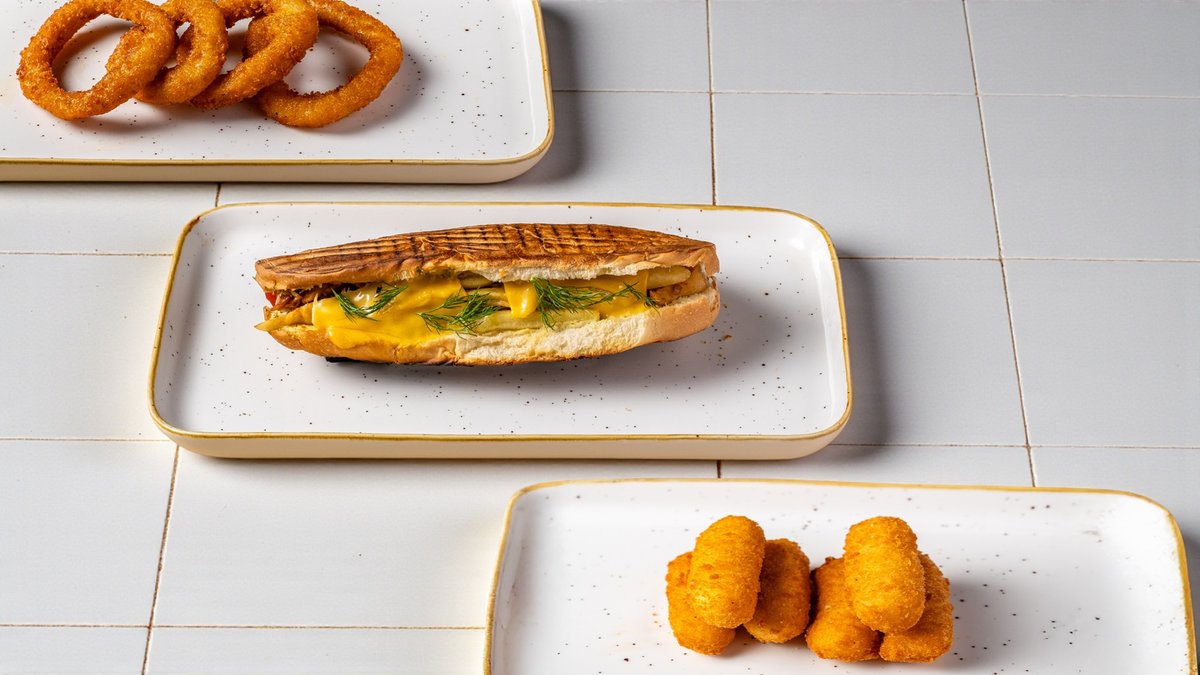 Датская булочка, стрипсы, лук жареный, помидоры, соус цезарь, соус барбекю.