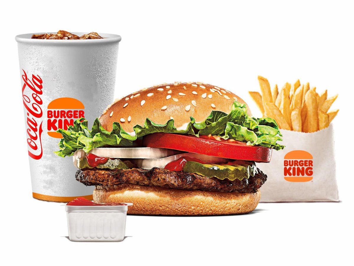 Две котлеты из 100% говядины, приготовленных на открытом огне, микс свежих овощей, соусы кетчуп и майонез на пшеничной булочке с кунжутом + Кинг Фри М + Coca-Cola 0,5 мл + соус на выбор