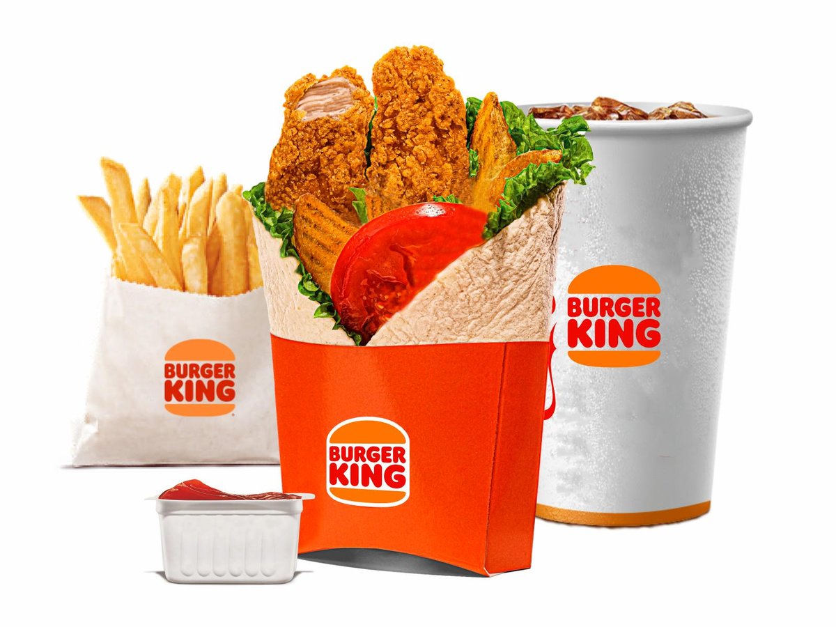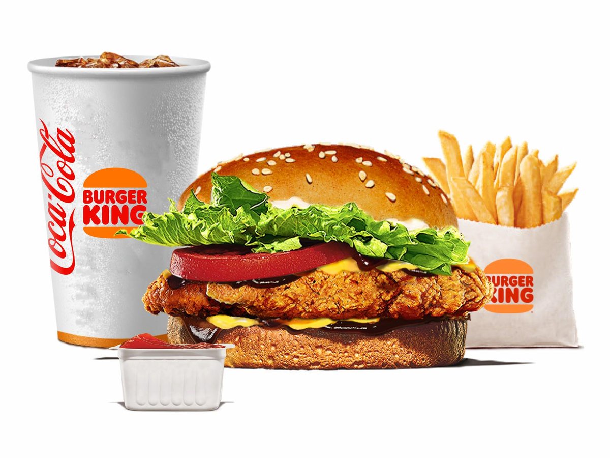 Сытный куриный бургер со свежими овощами и с двойной хрустящей котлетой в кукурузной булочке + Кинг Фри М + Coca-Cola 0,5 + соус на выбор