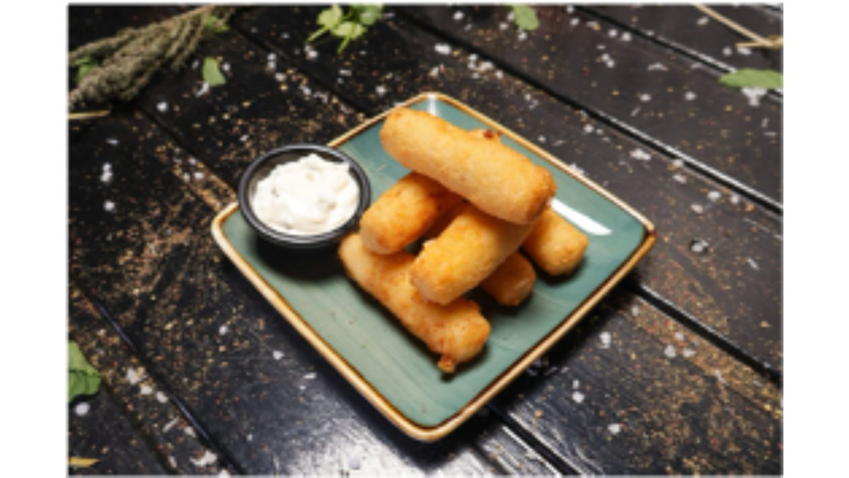 Чесночные гренки, дольки, жареный чечил, охотничьи колбаски, кетчуп, соус тартар.