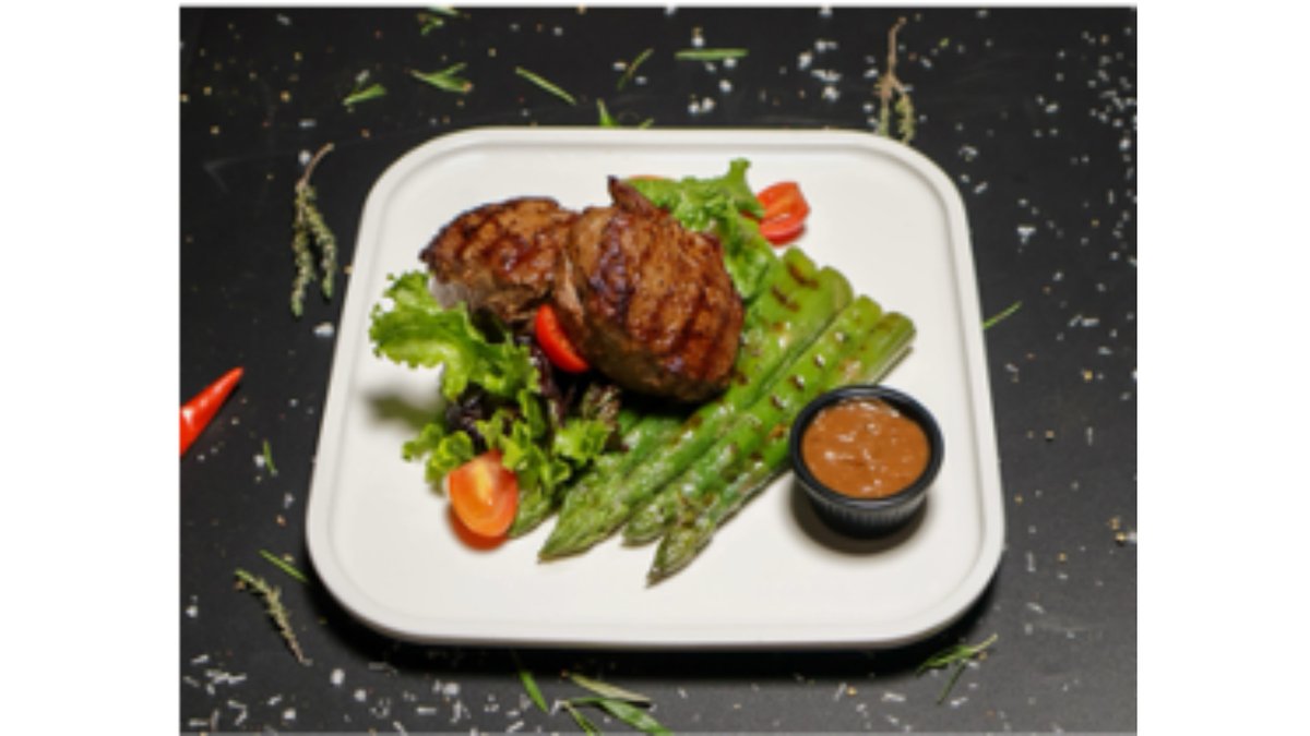 Мясо минутка, микс салата, спаржа, помидоры черри, соус демигляс.