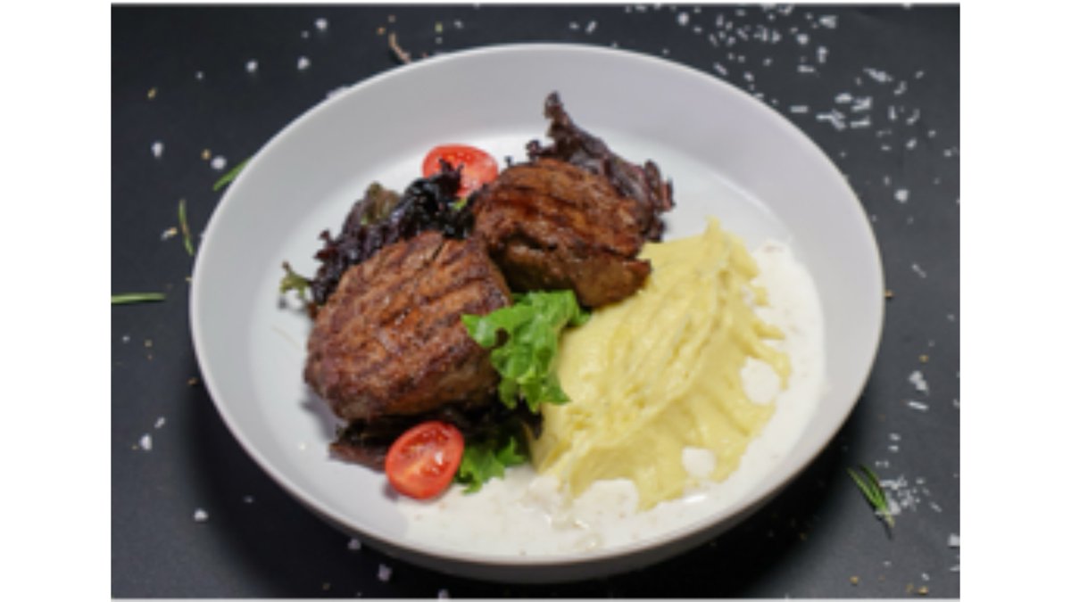 Мясо минутка, микс салата, картофельное пюре, сливочный соус.