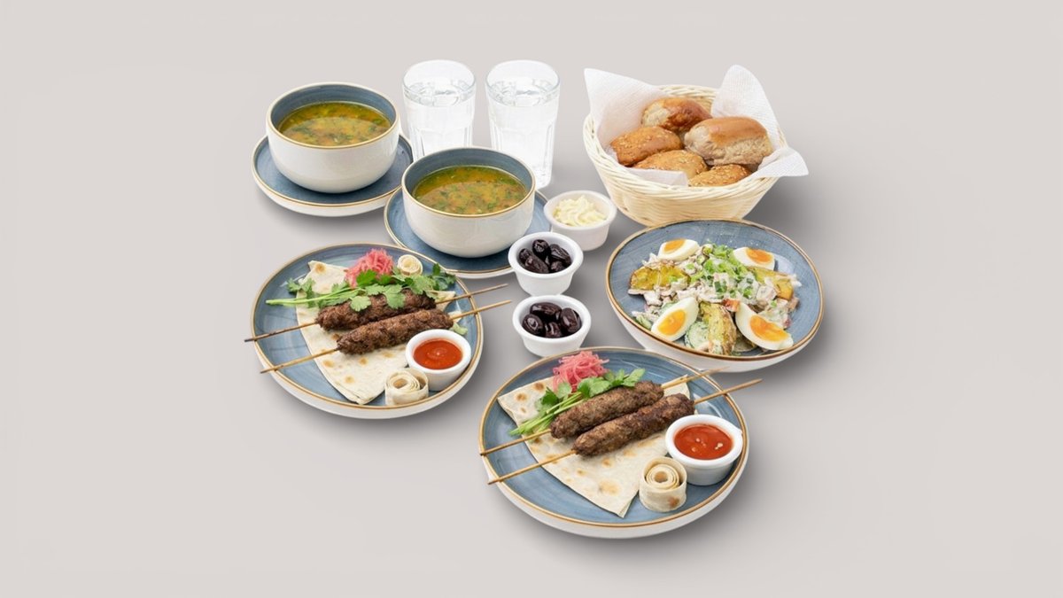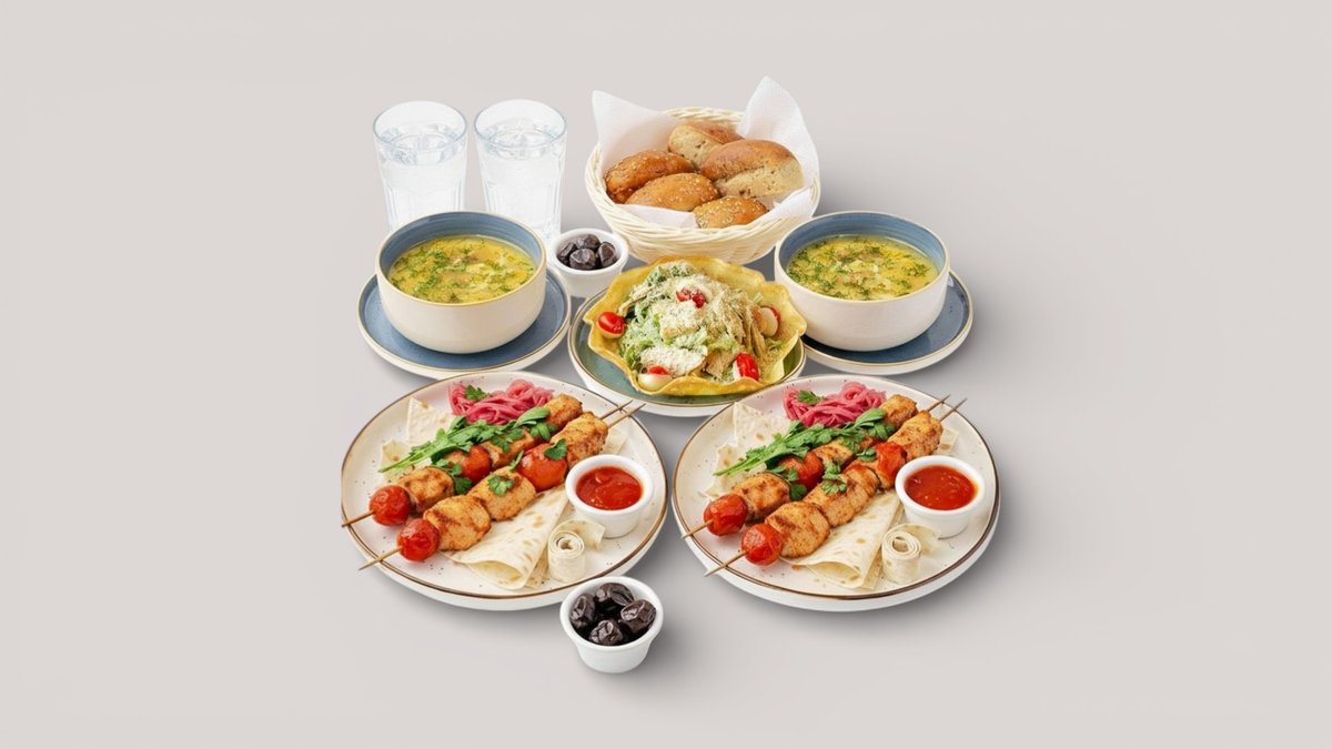 Салат с копченой курицей и картофелем, домашний куриный суп (2 порции), гриль-шпажки из говядины (2 порции), вода, финики.