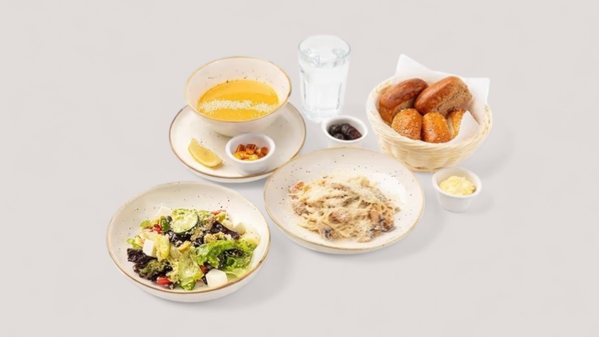 Чечевичный крем-суп мини, мини-салат греко, мини-паста Альфредо, вода, финики.