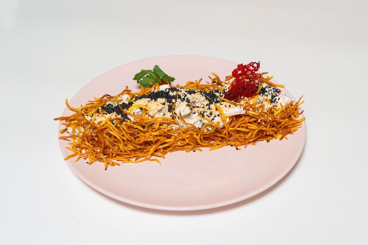 "Оливье" - изысканный салат с говяжьим языком, вареным картофелем, морковью и зеленым горошком.