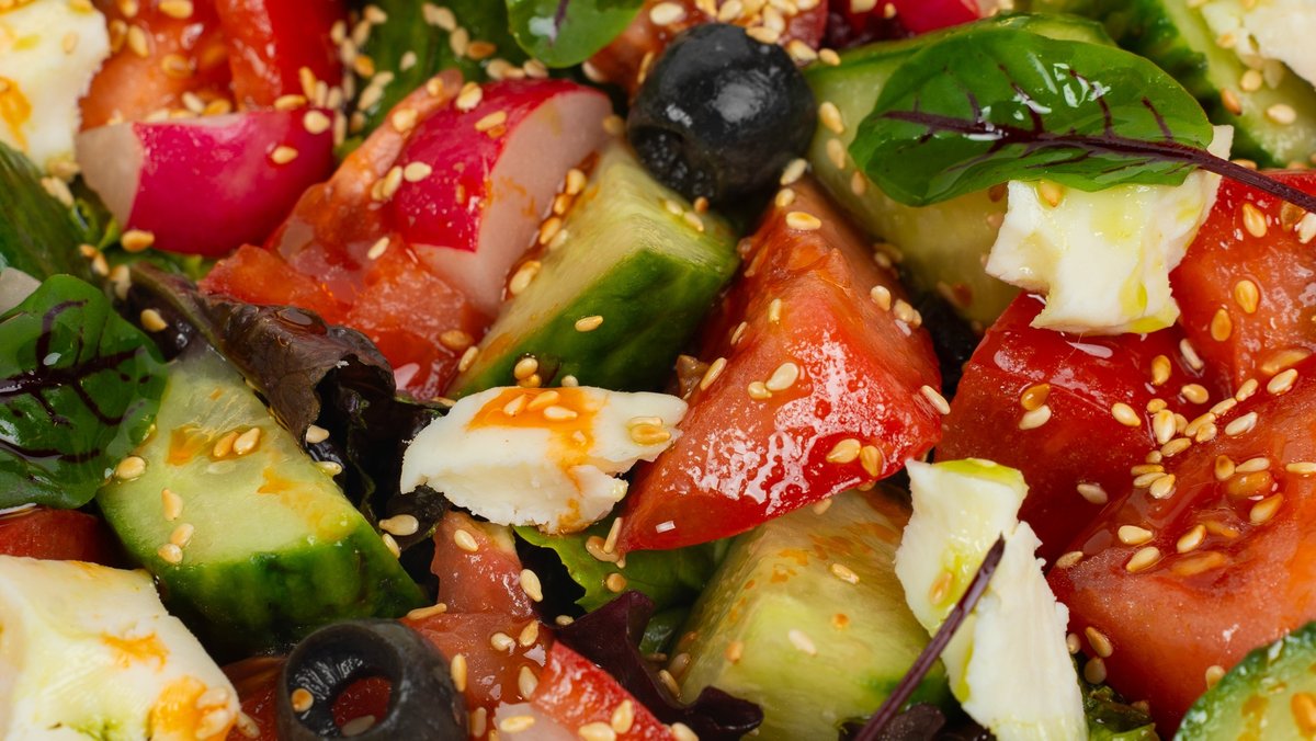 Освежающий салат из свежих помидоров, хрустящего огурца, ароматной зелени, заправленный дрессингом, с сыром брынза.🥗