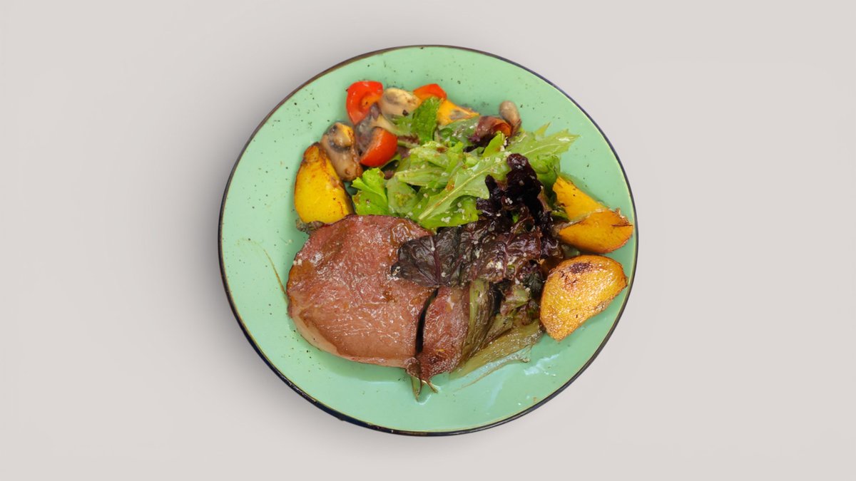 Говяжья вырезка, куриное филе, грузди, огурцы, картофель