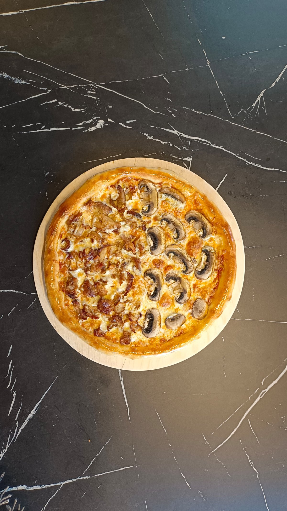 Тесто, куриное филе, итальянская моцарелла, томатный соус, грибы шампиньоны.