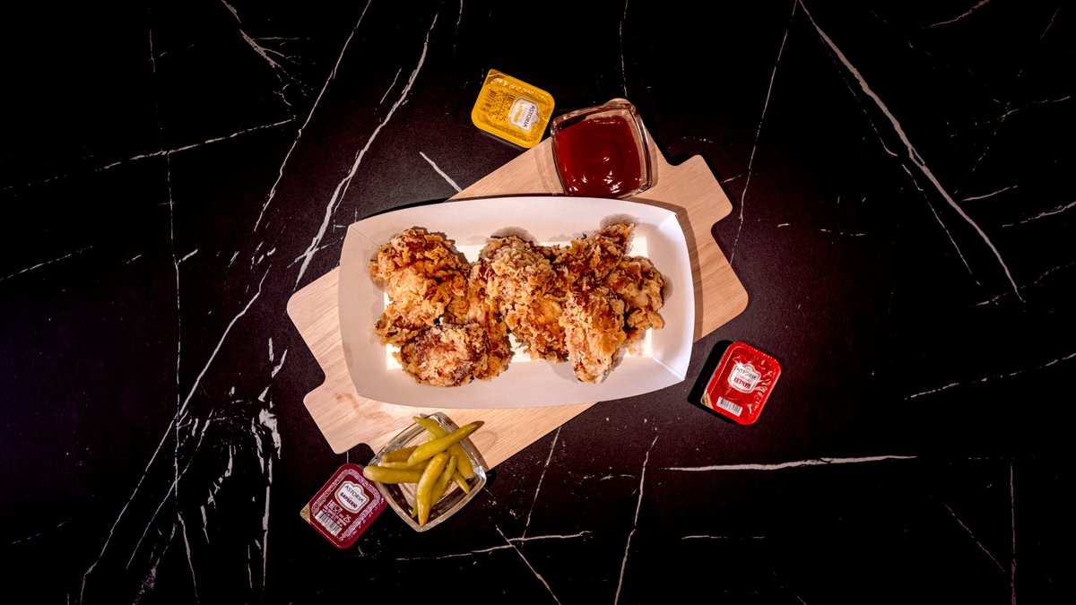 Багет, куриное мясо (халал), помидоры, огурцы, свежий обжаренный картофель, фирменный белый соус, турецкий красный соус.