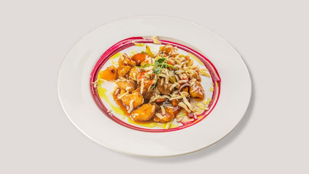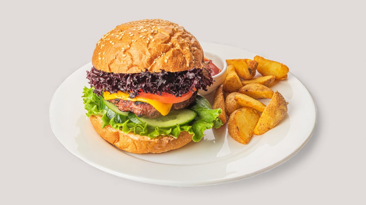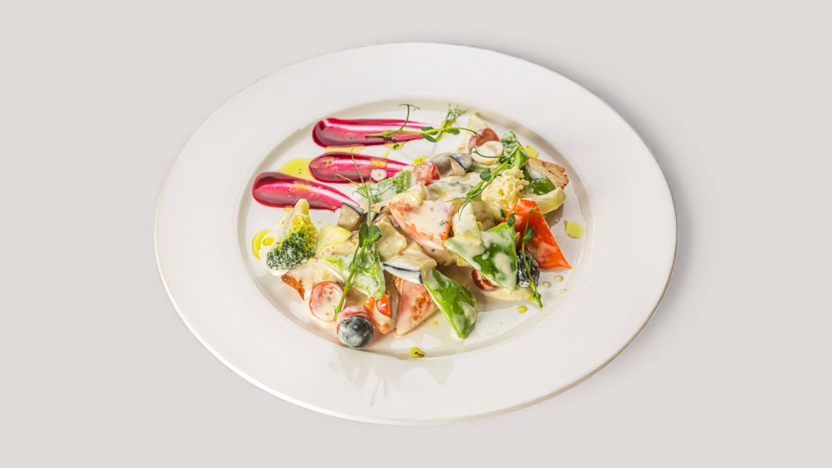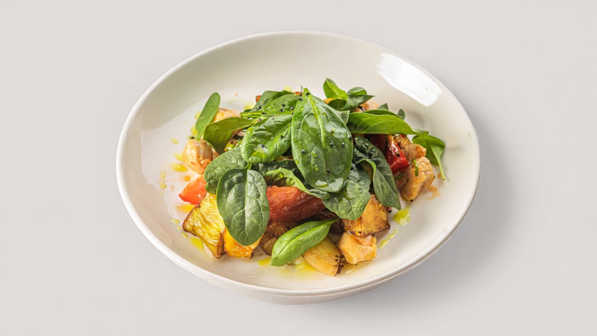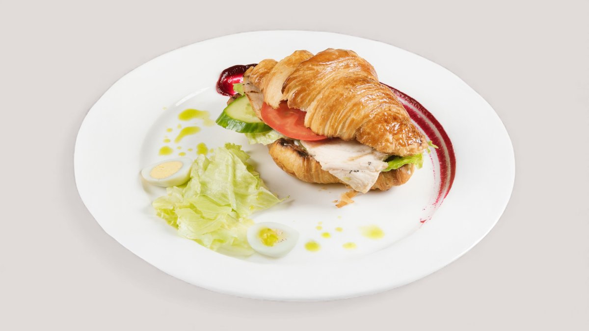Листья салата,томаты,огурцы,копченная индейка,соус кетчунез
