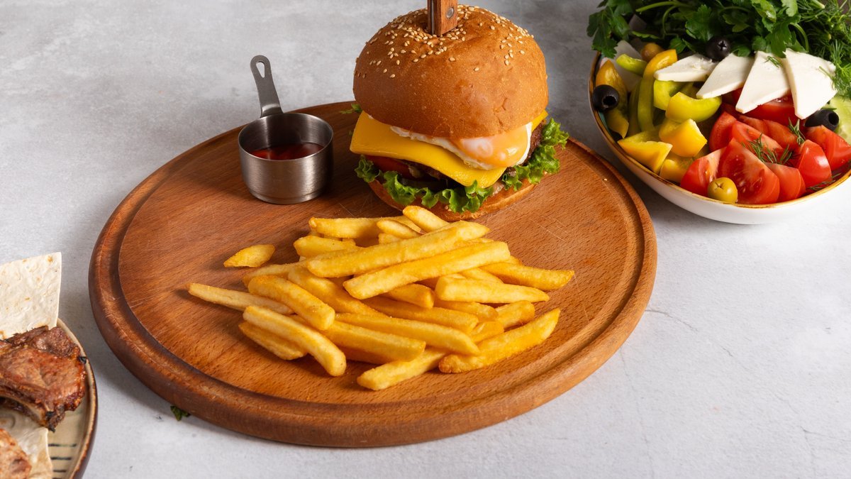 Булочка, котлета, сыр, картофель фри