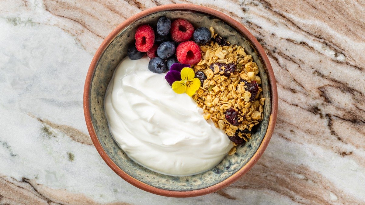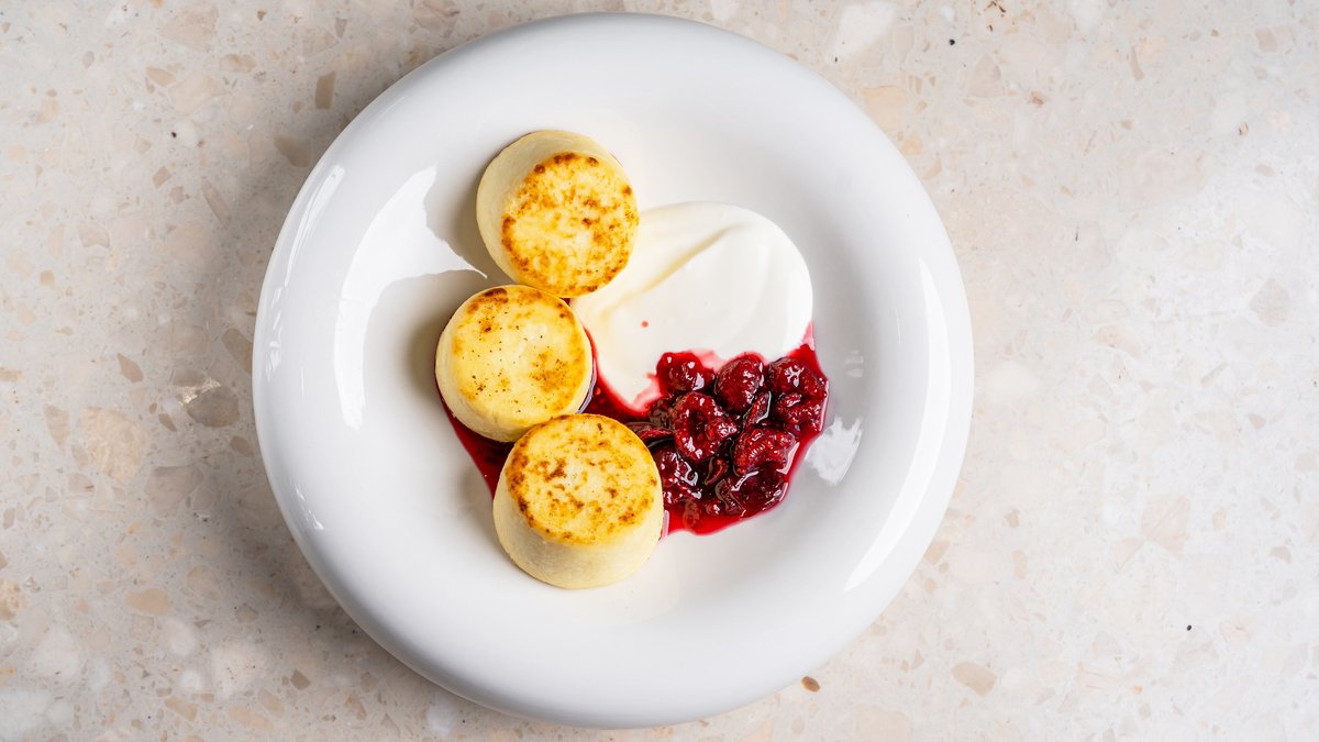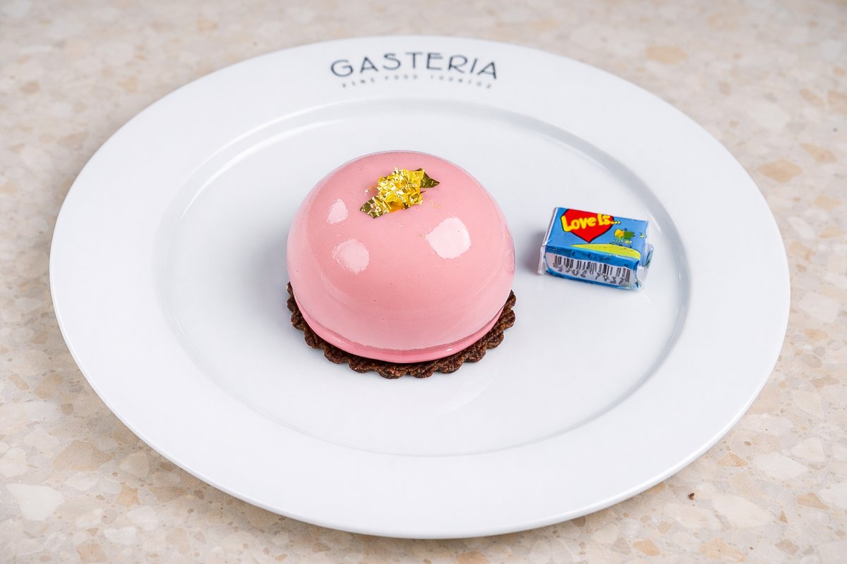 Мусс на основе йогурта конфи, красная смородина, крем на белом шоколаде, миндальный бисквит