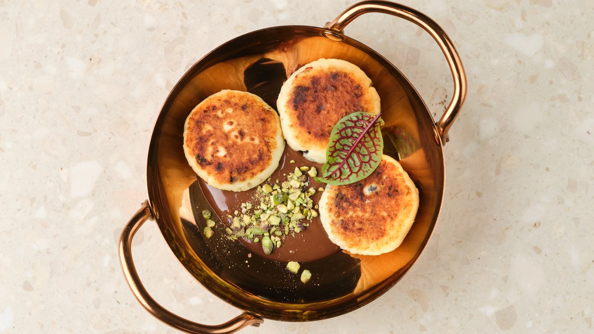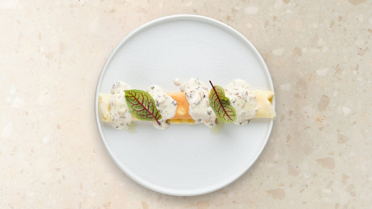 Бриошь, соус Бешамель, копченая индейка, сыр Гауда, сыр Чеддер,трюфель, руккола