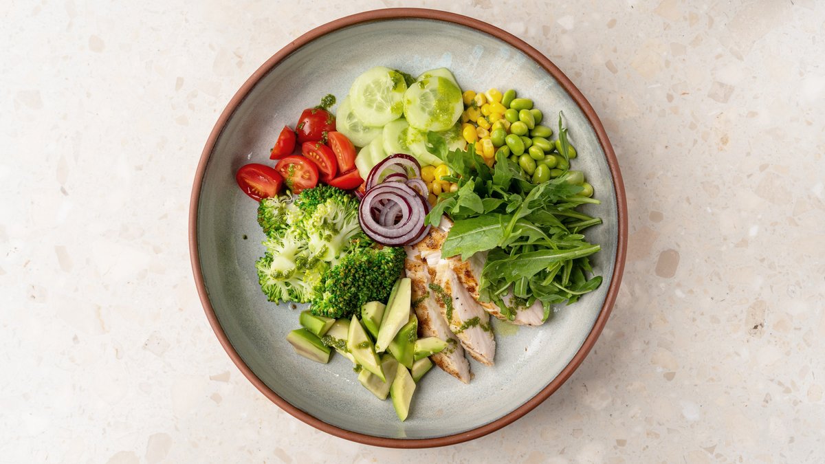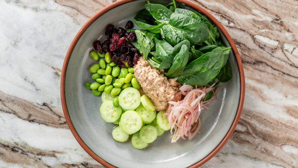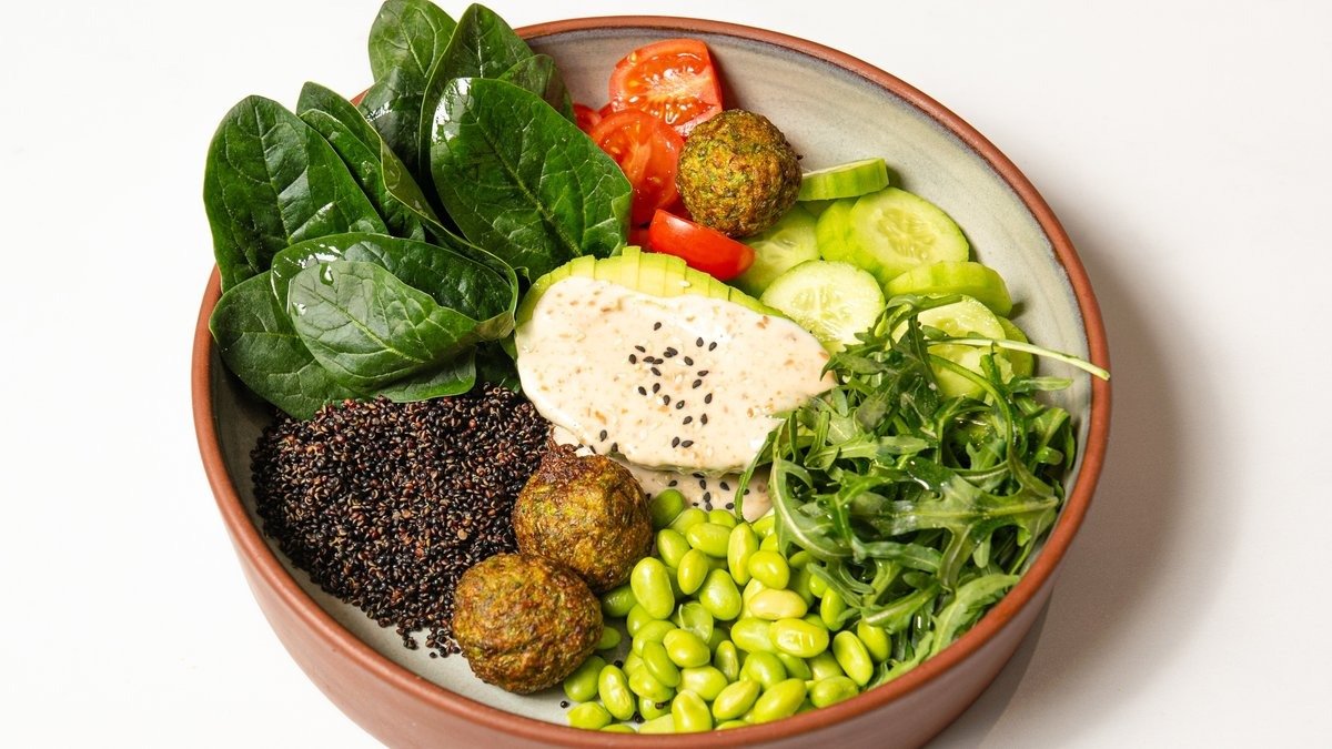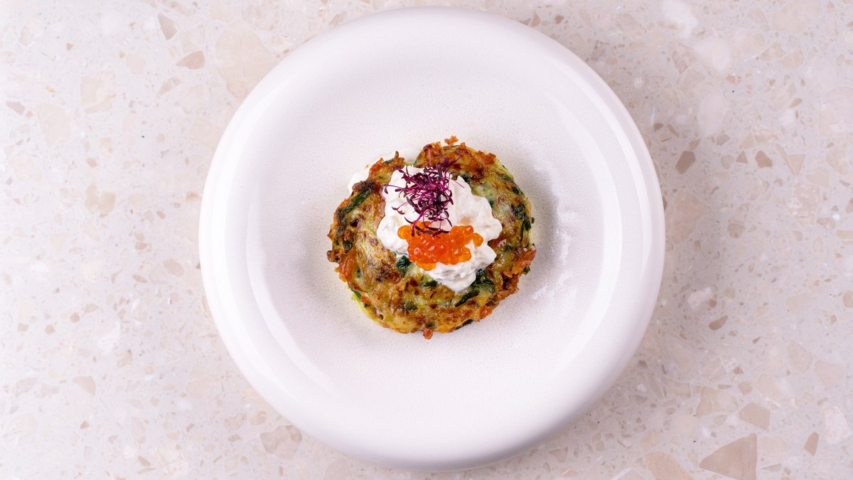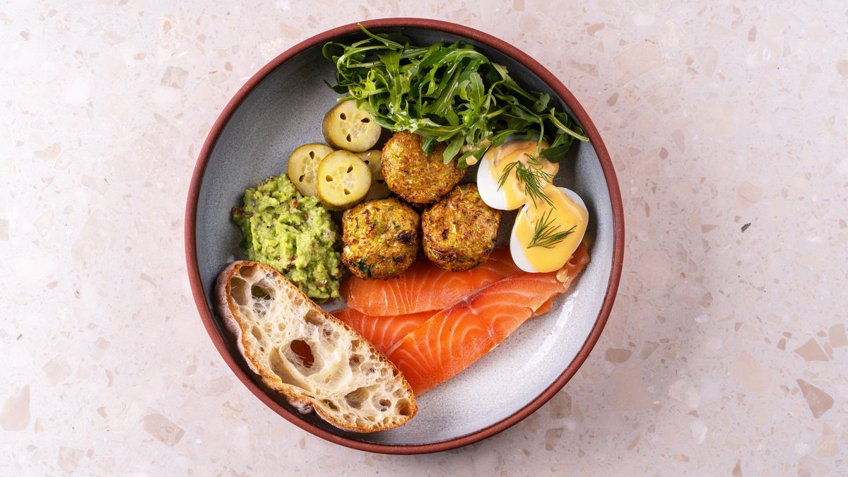 Яйцо вареное, соленый огурец, кабачковые драники, руккола, гуакамоле, соус голандский, чиабатта, лосось с/с