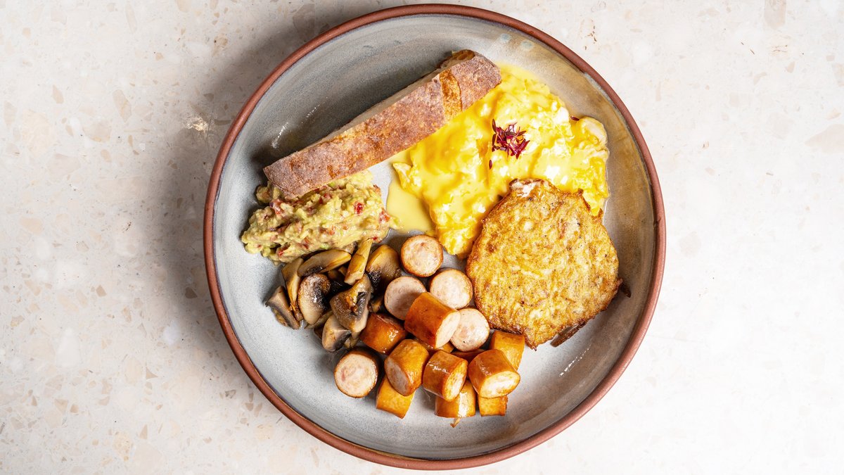 Скрембл, соус голандский, куриная колбаска, грибы шампиньоны, картофельный драник, гуакамоле, чиабатта