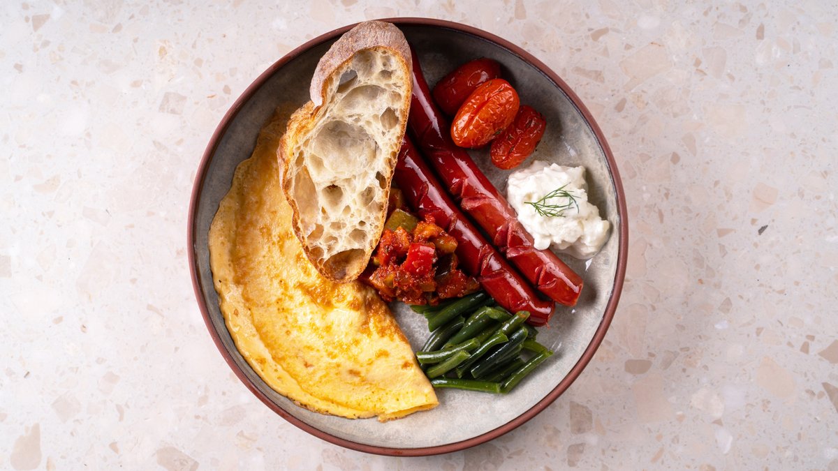 Омлет, говяжьи колбаски, овощное рагу, стручковая фасоль, творожный сыр, томаты черри конфи, чиабатта