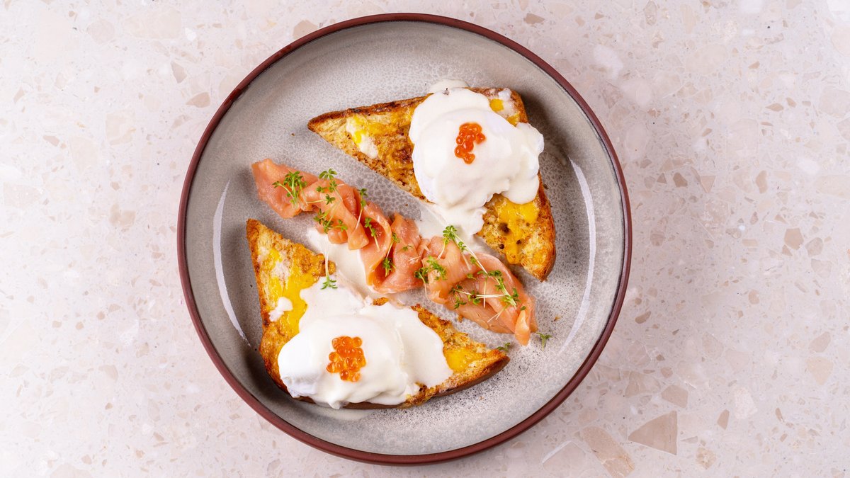 Бриошь, соус Бешамель, сыр гауда, яйцо пашот, лосось с/с, красная икра