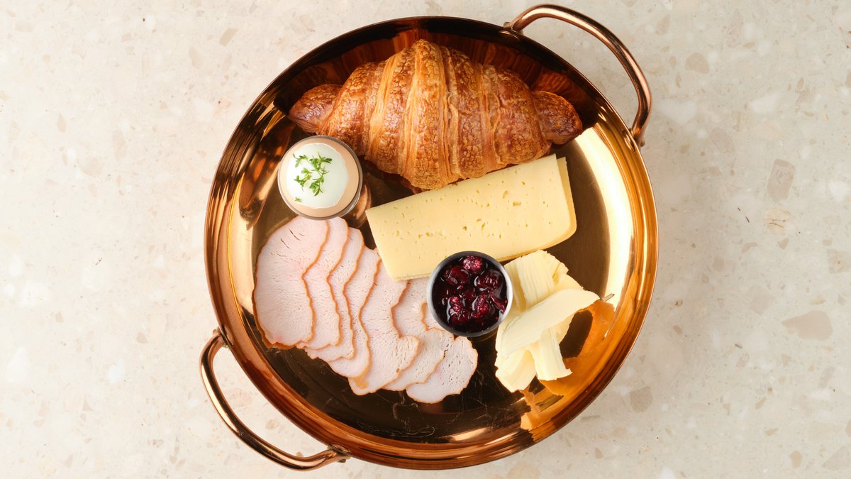 копченая индейка, яйцо вареное, джем, масло сливоное, сыр Маасдам