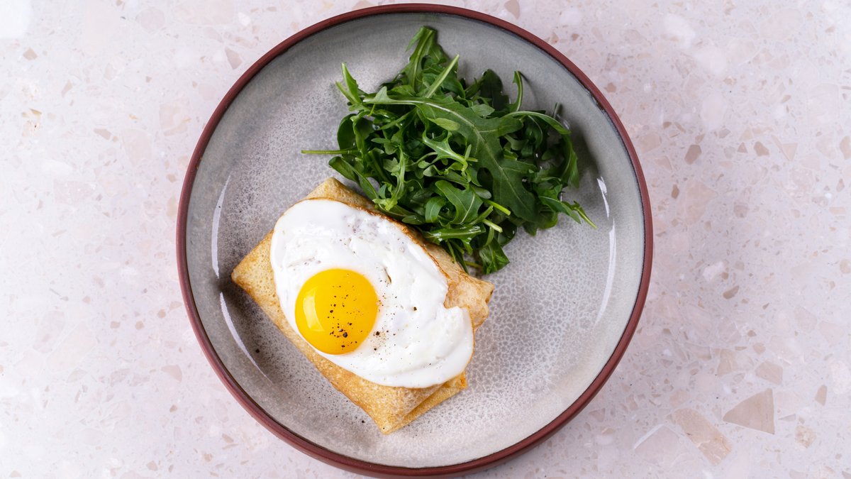 Блинчик, копченая индейка, сыр гауда, руколла, глазунья