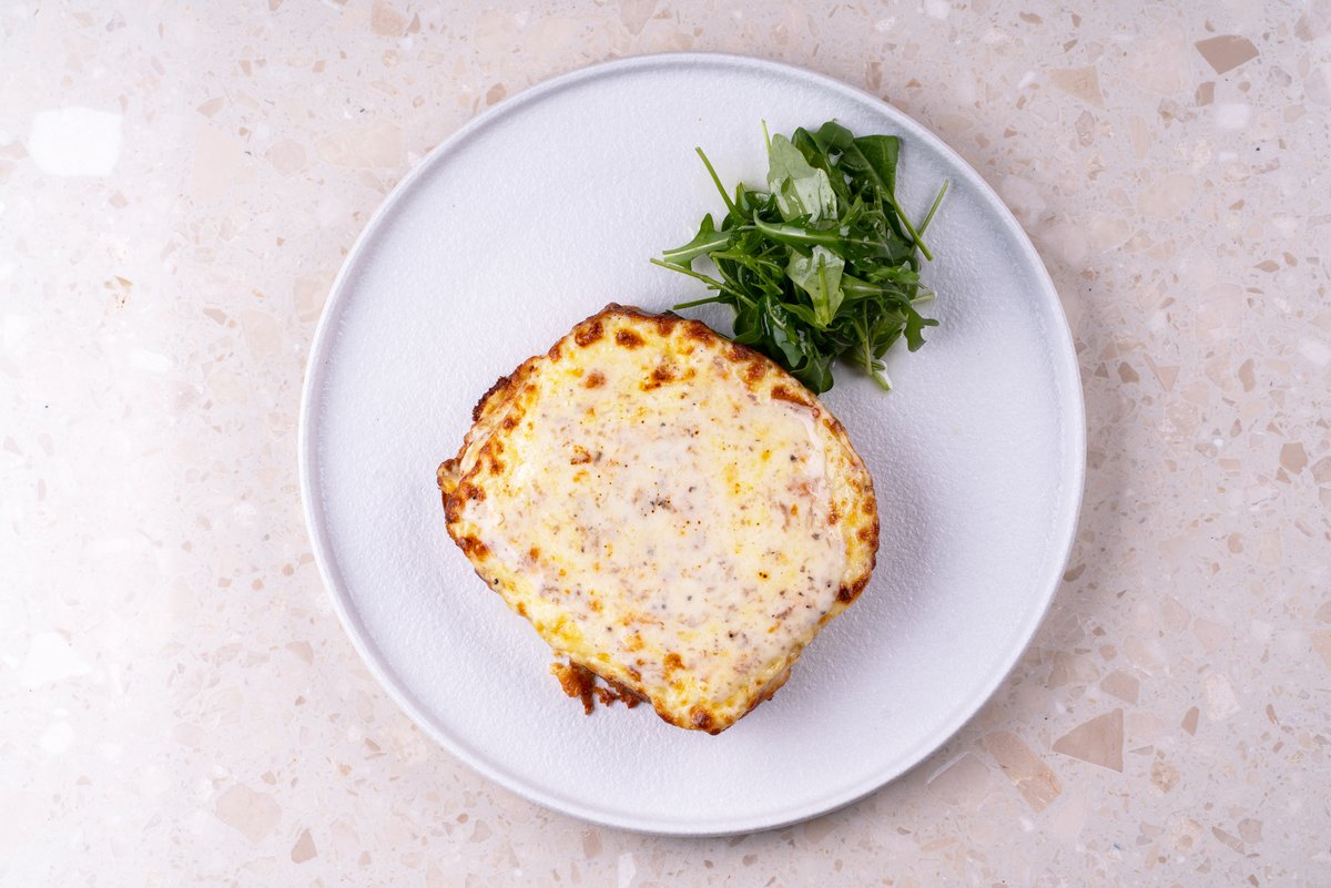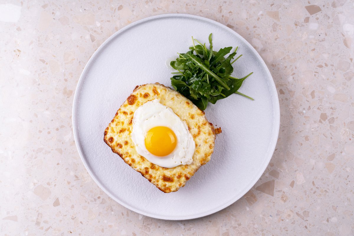 Бриошь, соус Бешамель, копченая индейка, сыр Гауда, сыр Чеддер, глазунья, руккола