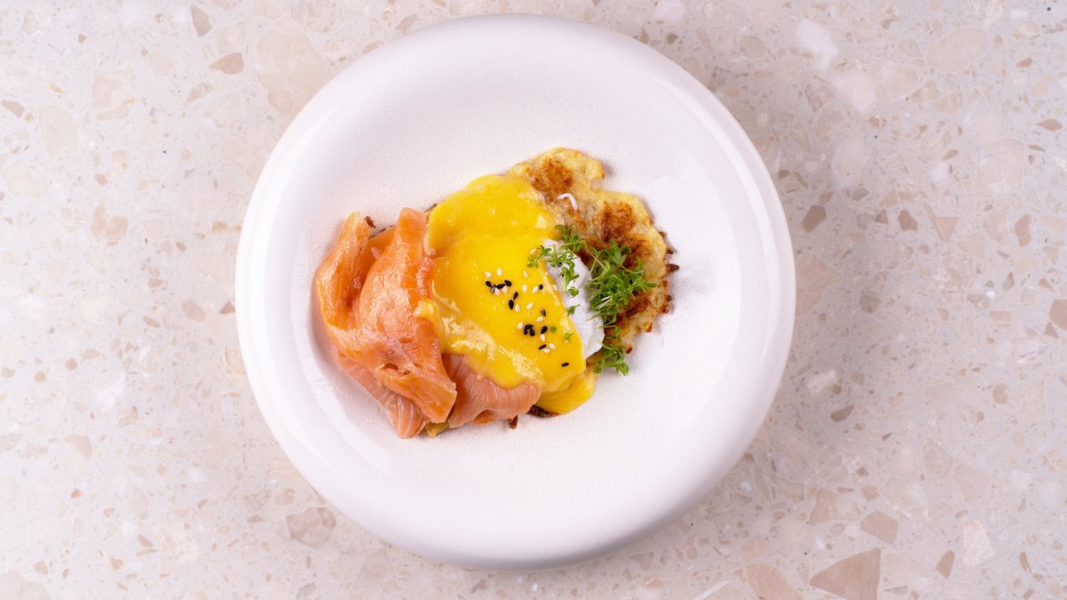 Картофельный хашбраун, лосось с/с, яйцо пашот, соус Голандский, кунжут