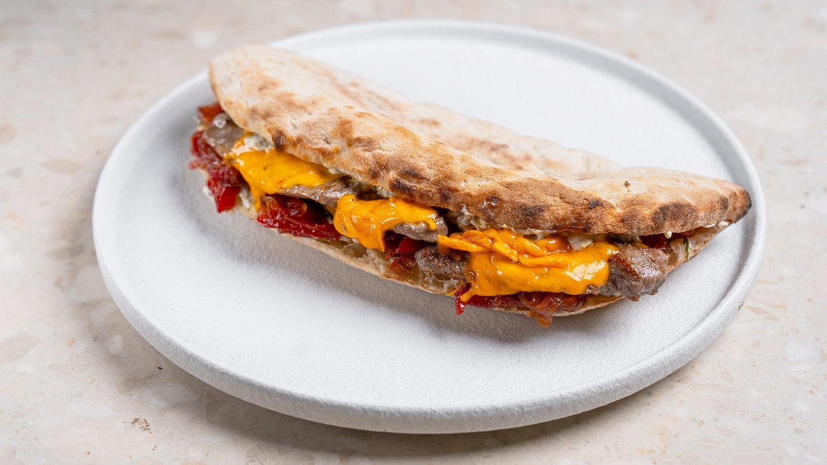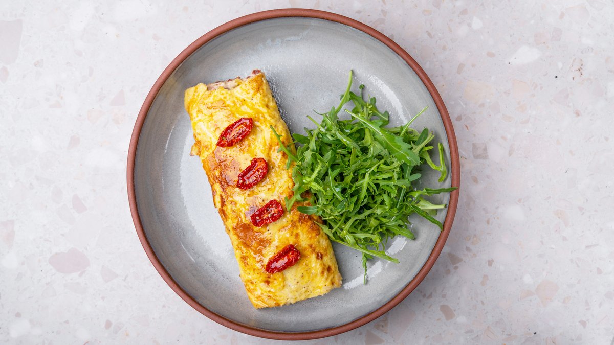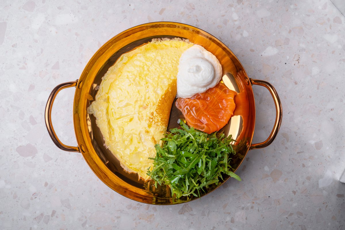 Омлет, творожный сыр, копченая говядина, каперсы, томаты черри конфи, руккола