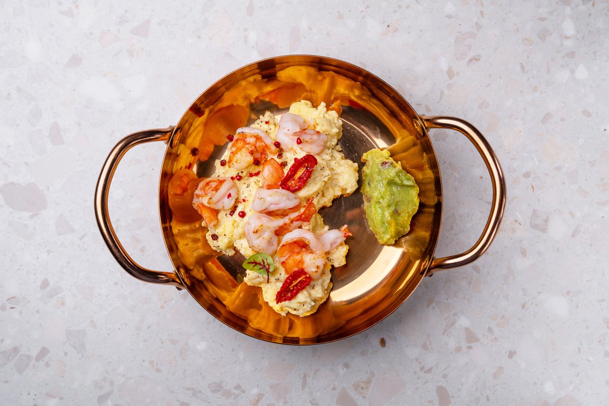 Скрэмбл, креветки, томаты черри конфи, гуакамоле