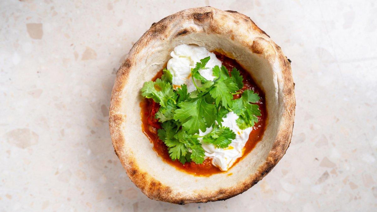 Болгарский перец, лук репчатый, помидоры, томатный соус, яйца пашот, кинза, неаполитанский хлеб