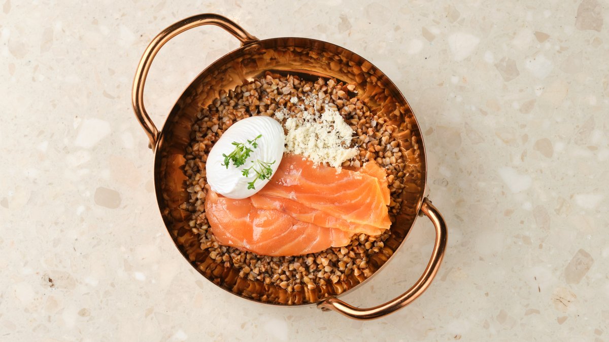 Гречка, лосось с/с, яцо пашот, сыр Пармезан