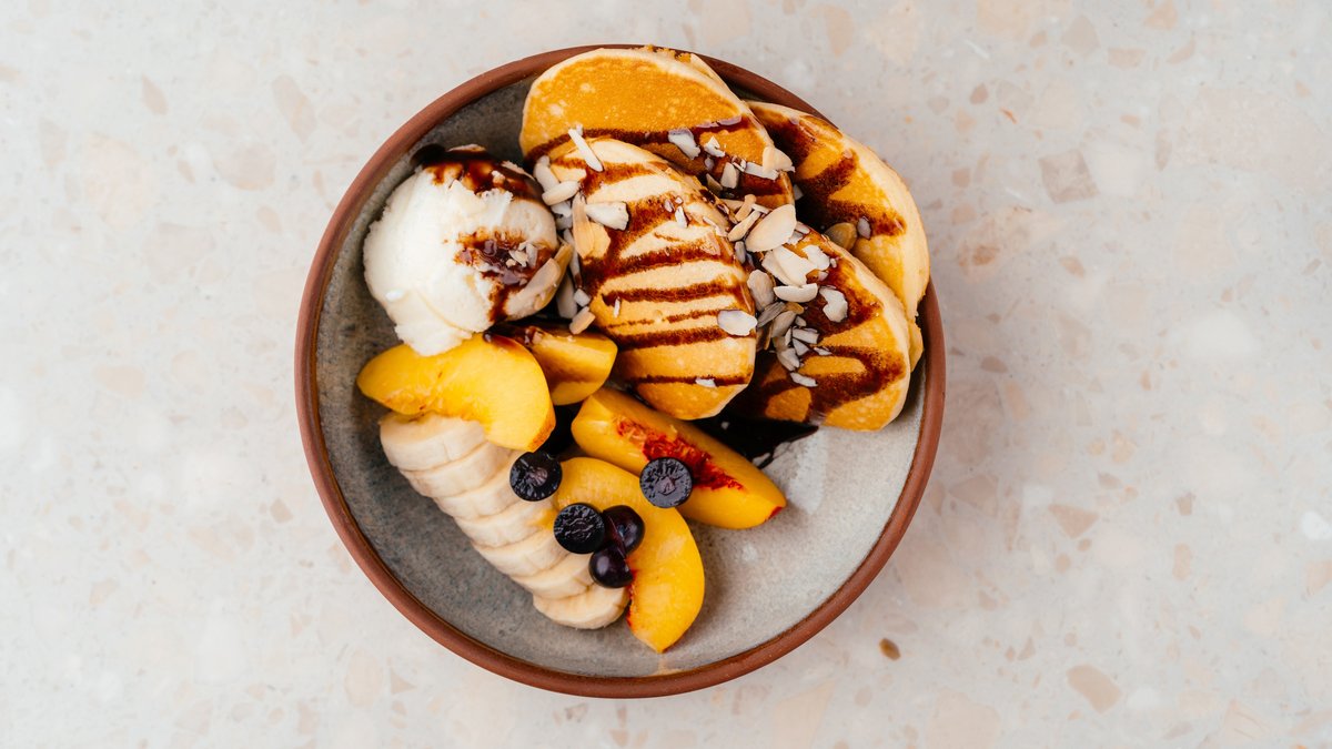 Панкейки, сезонные фрукты, шоколад, мороженное, миндальные слайсы