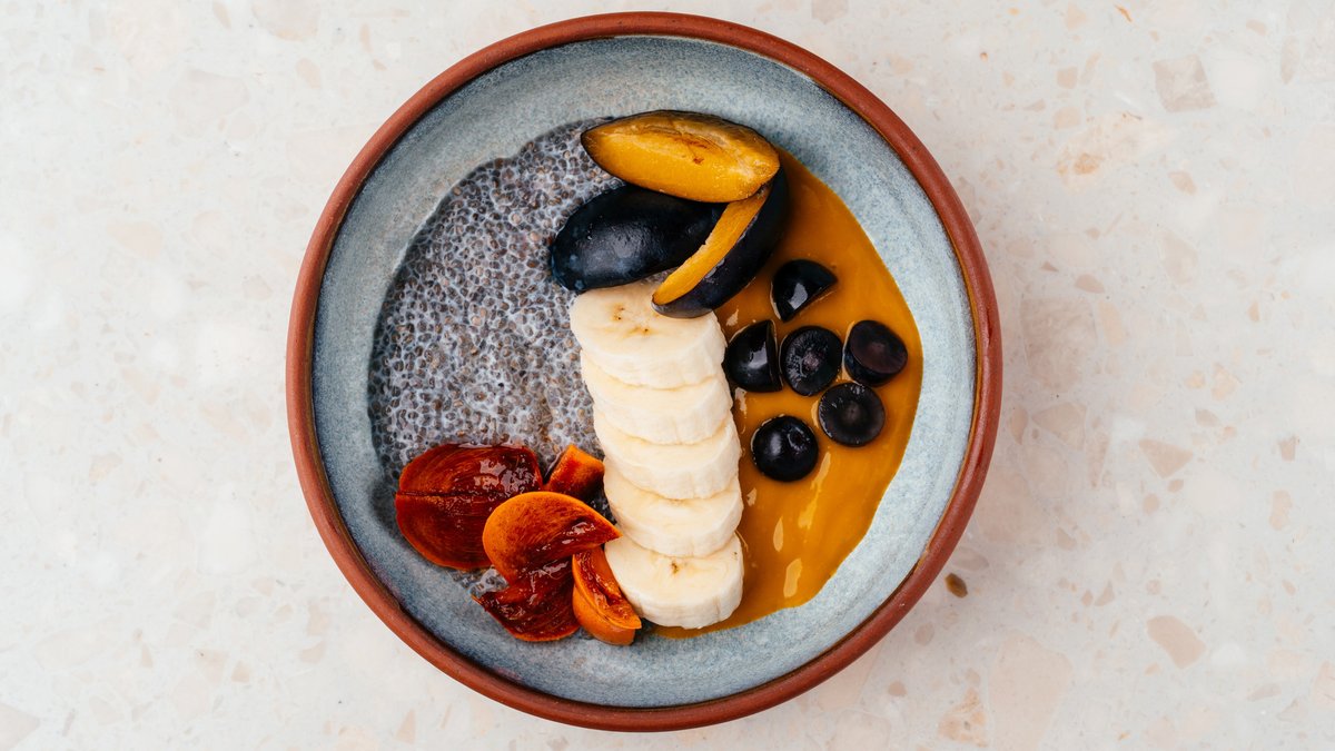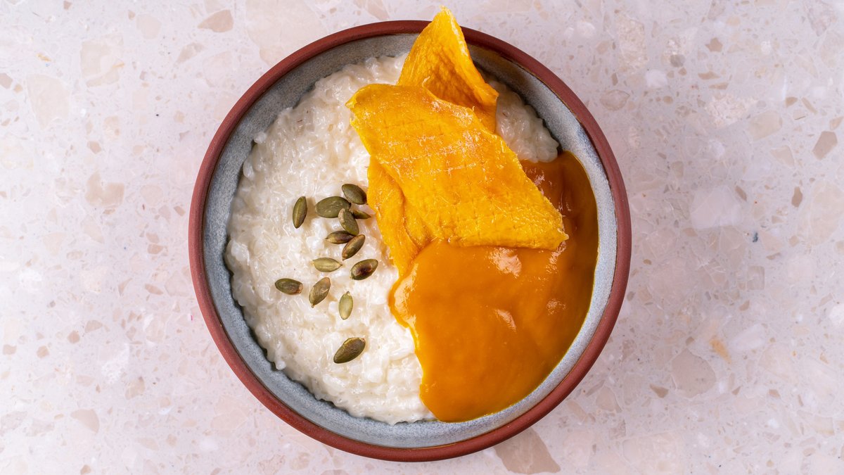 Рис, молоко, манго пюре, сухое манго, тыквенные семечки