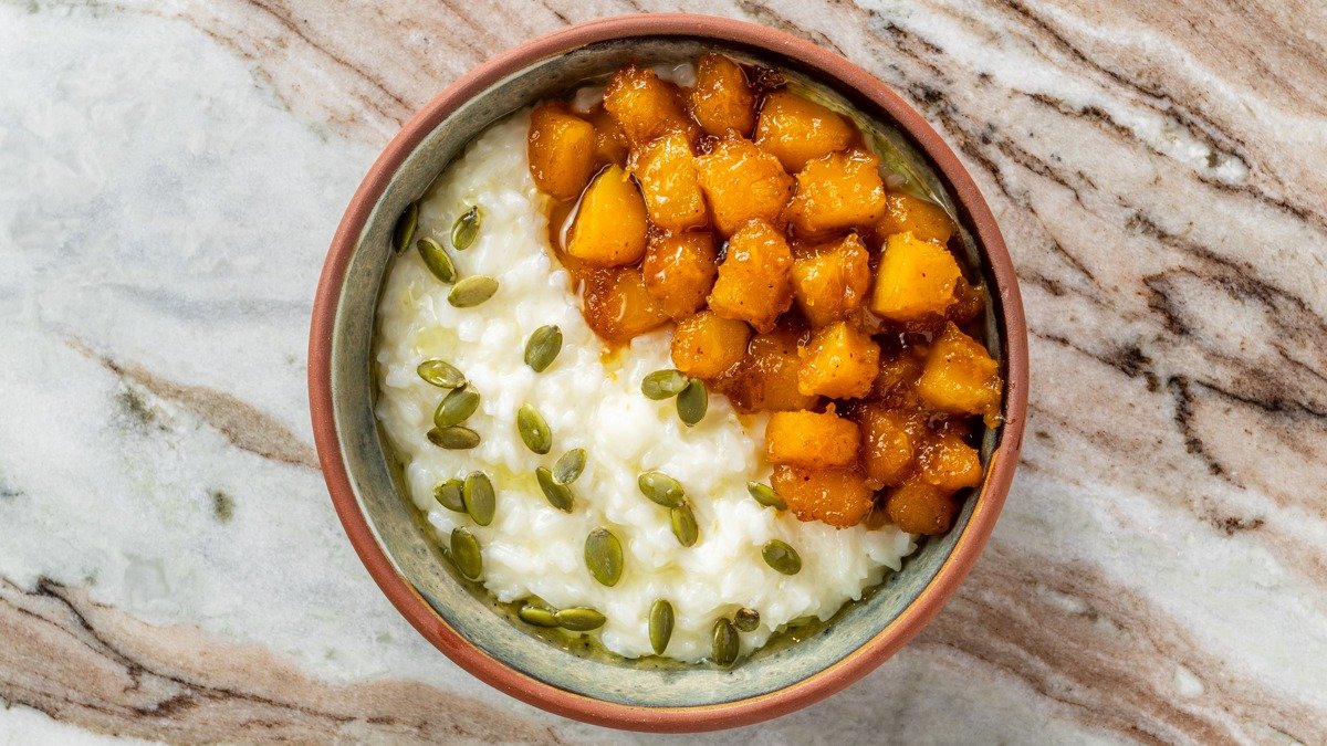 Рис, молоко, сливочное масло, тыквенные семечки, карамелизированная тыква