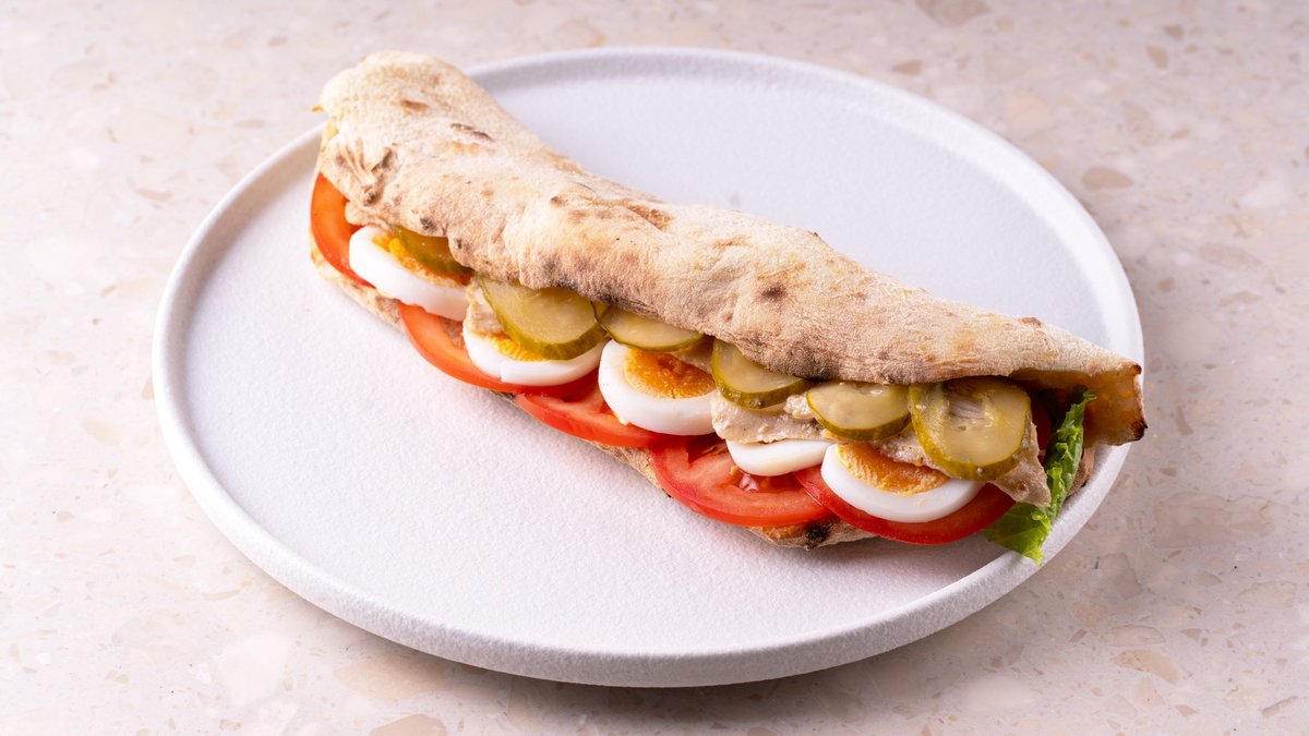 Неаполитанское тесто, яйцо вареное, куриное филе, кетчуп, майонез, помидоры , соленый огурец
