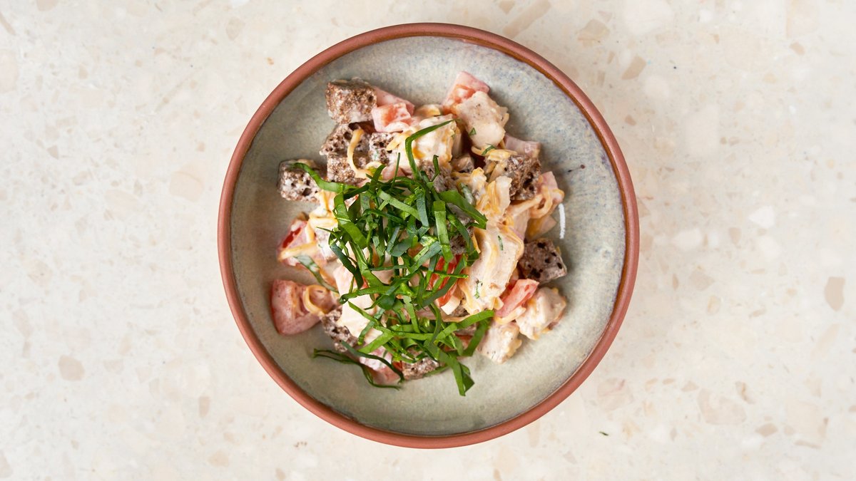 Чечевица, сливки, копченая говядина, лук, чиабатта