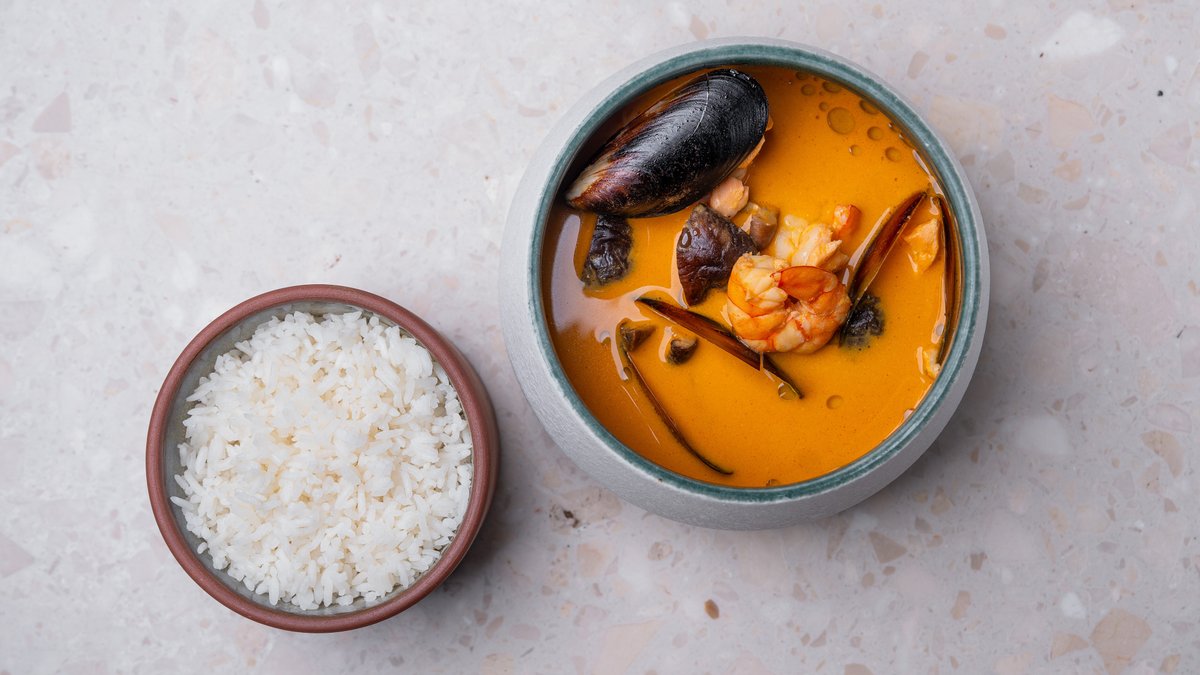 Том ям паста, куриный бульон, мидии, креветки, лосось, шиитаке грибы, кокосовое молоко, рис