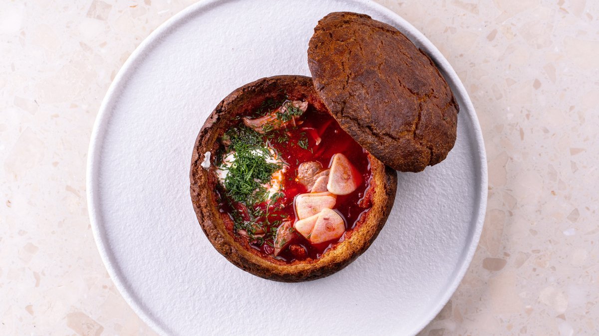 Капуста, лук, морковь, свекла, мясо говядины, бородинский хлеб, сметана, укроп