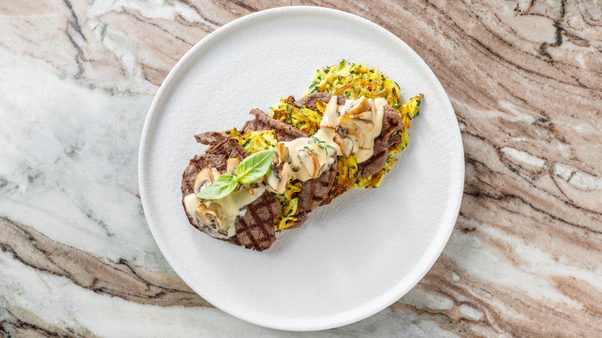 Говяжья вырезка, перечный соус, картофельный гратен, сыр Чеддер, перец черный, сливки