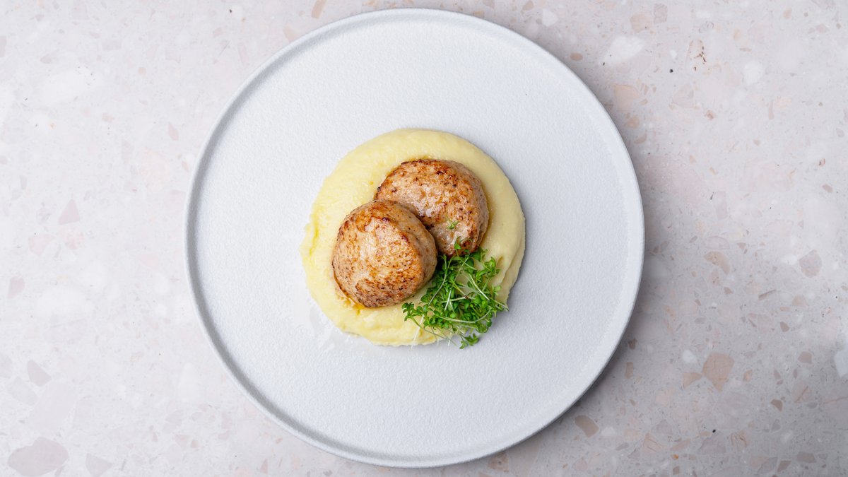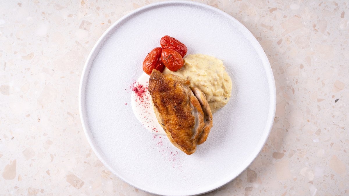 Курица филе, картофельное пюре, трюфельная паста, сливочный соус, томаты черри конфи