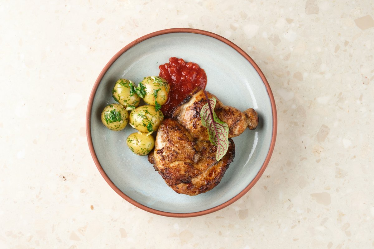 Цыпленок жареный, бейби картофель вареный, соус Аджика, чеснок, укроп