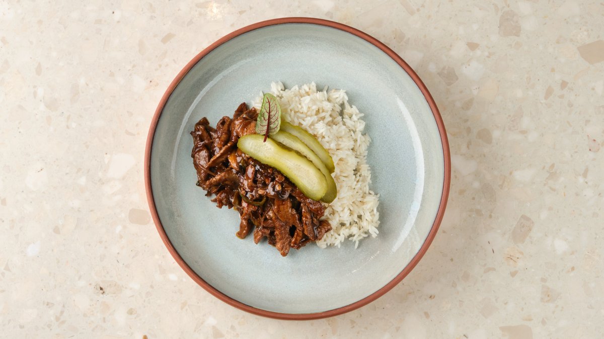 Грвядина жареная, рис, соус Демиглас, соленый огурец, репчатый лук, грибы