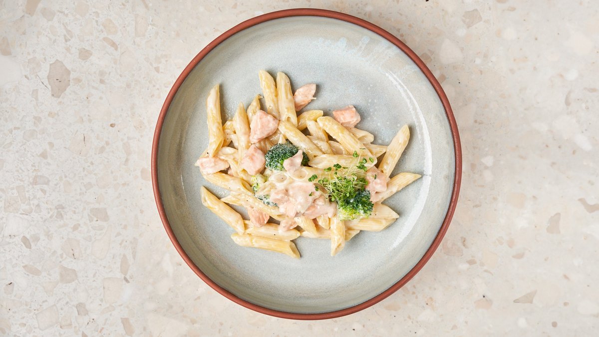 Пенне, колбаски говяжьи, курица, чили, сливки, Пармезан