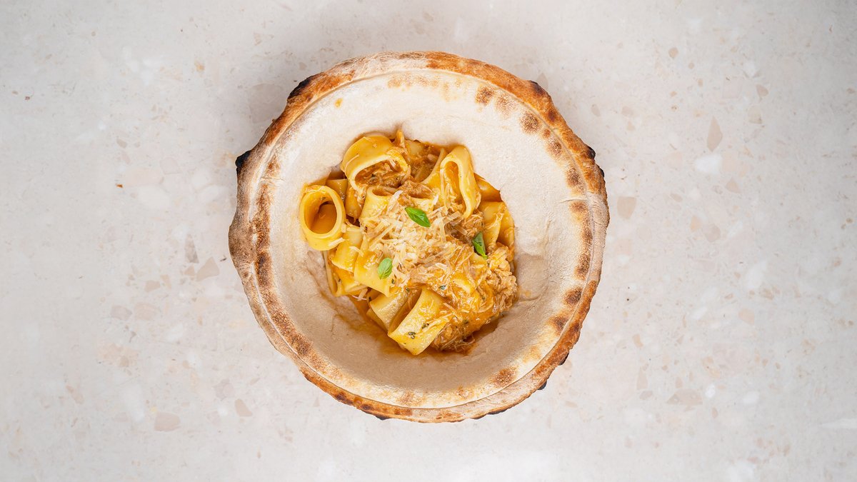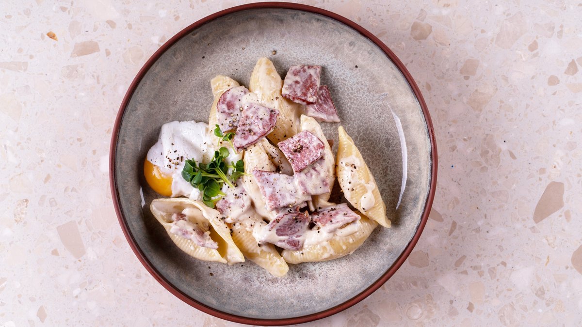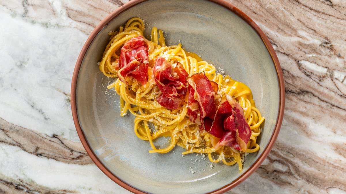 Паста, вяленая говядина, сыр Пармезан, яичные желки, черный перец