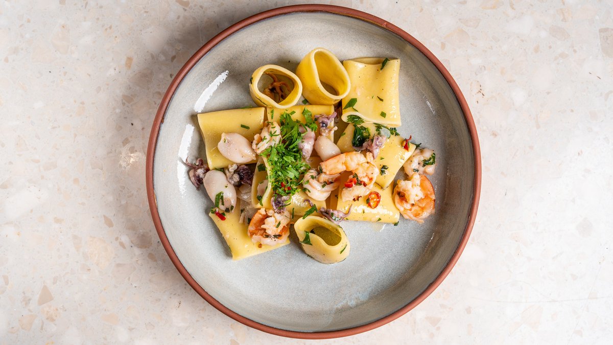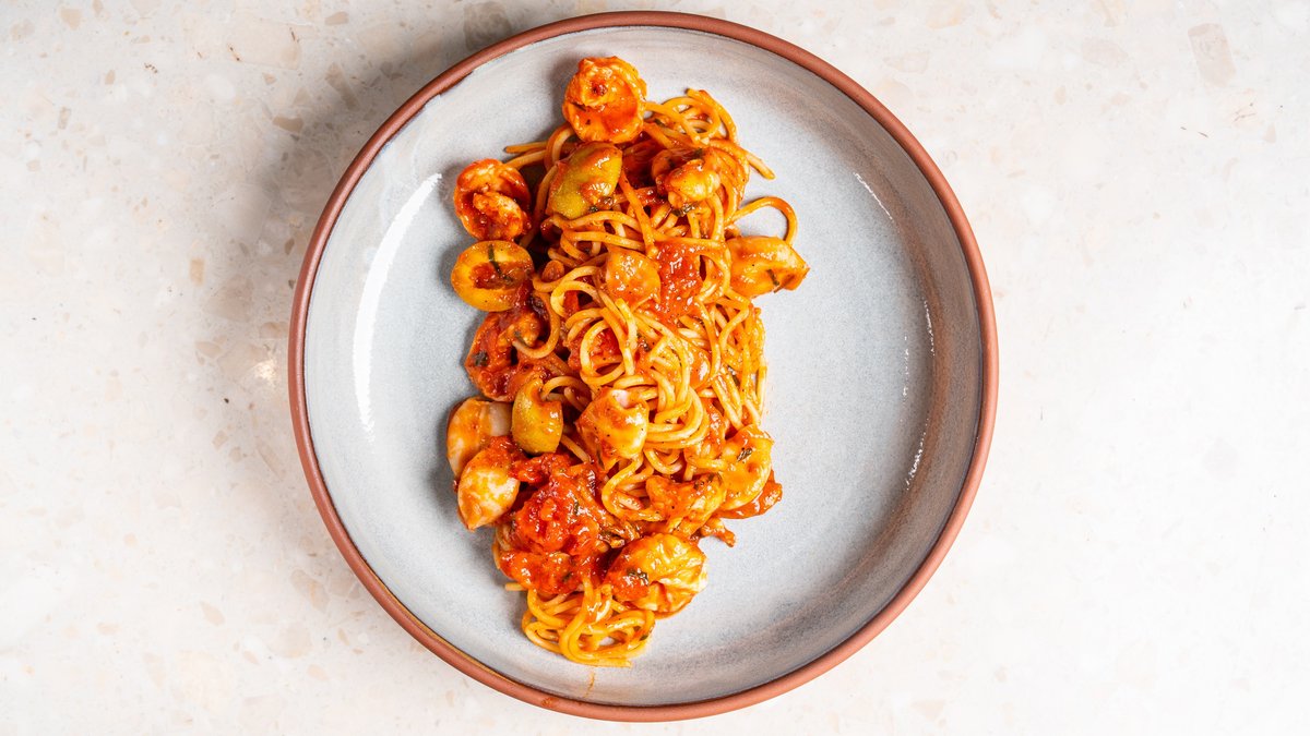 Паста, креветки, кальмары, оливковое масло, чили, чеснок, петрушка