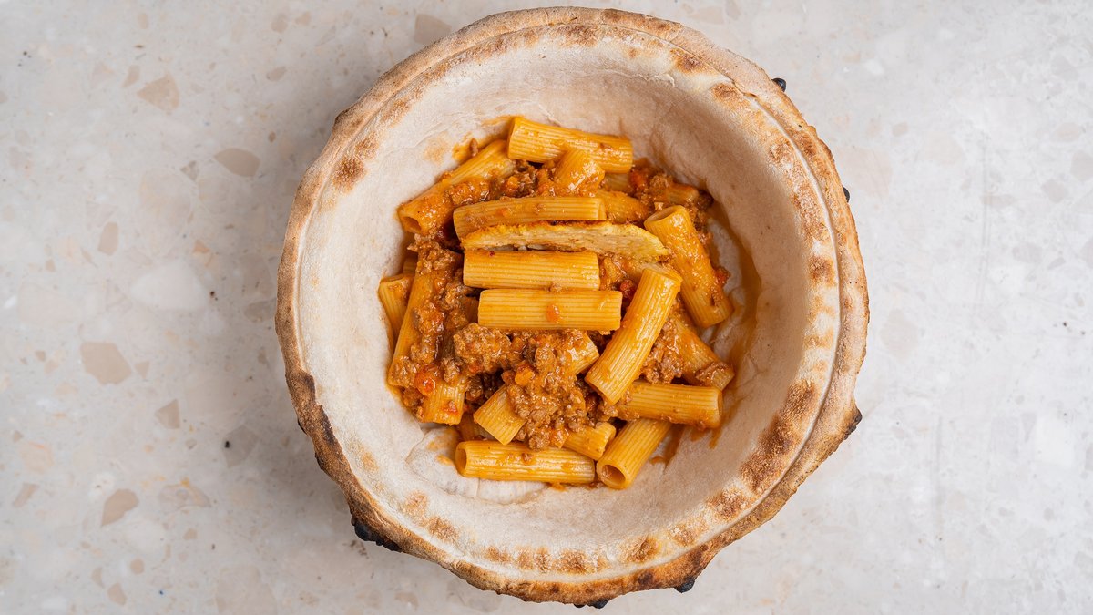 Ригатоне, фарш говяжий, лук, морковь, сердерей, чеснок, томатный соус, красное вино, сыр пармезан, неаполитанский хлеб