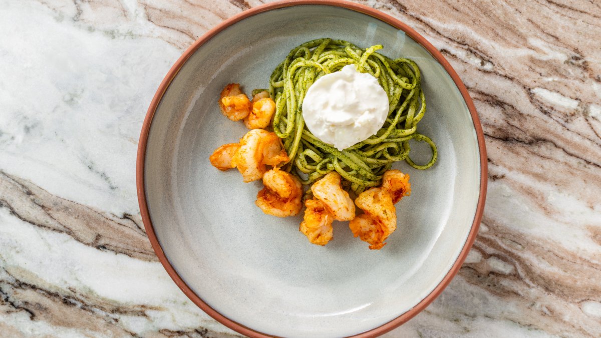Лингвини, креветки, соус Песто, сыр Страчателла