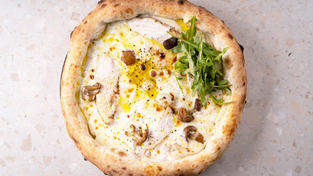 Неаполитанское тесто, копченая индейка, грибы шампиньоны, базилик, оливковое масло, сыр Моцарелла