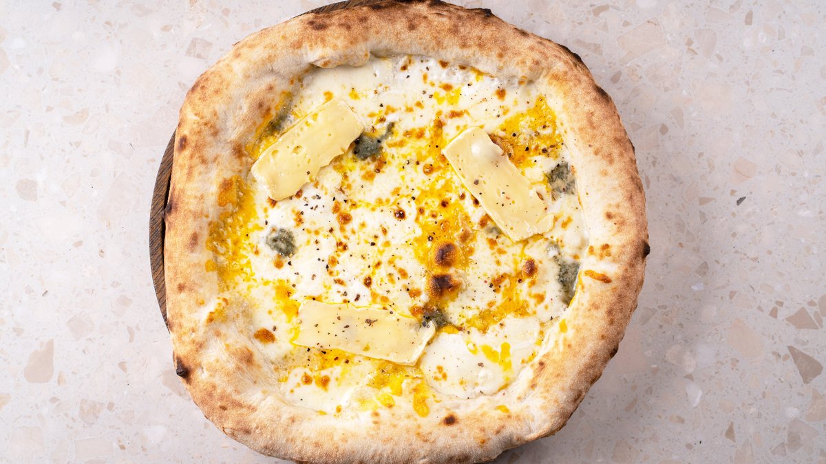 Неаполитанское тесто, сыр Моццарела, сыр Гауда, сыр Чеддер, сыр Горгонзола, сыр Камамбер, сливочный соус