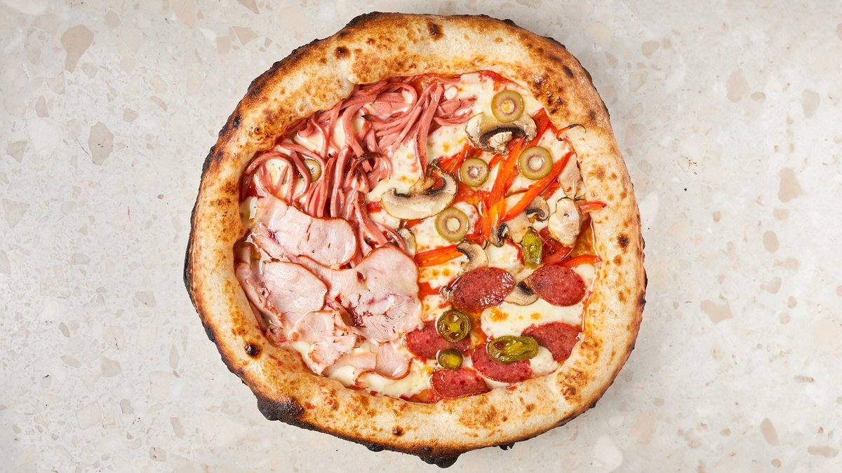 Неаполитанское тесто, вареная колбаса, грибы шампиньоны, оливки, салями , халапеньо, индейка копченая, сыр Моццарела , томатный соус