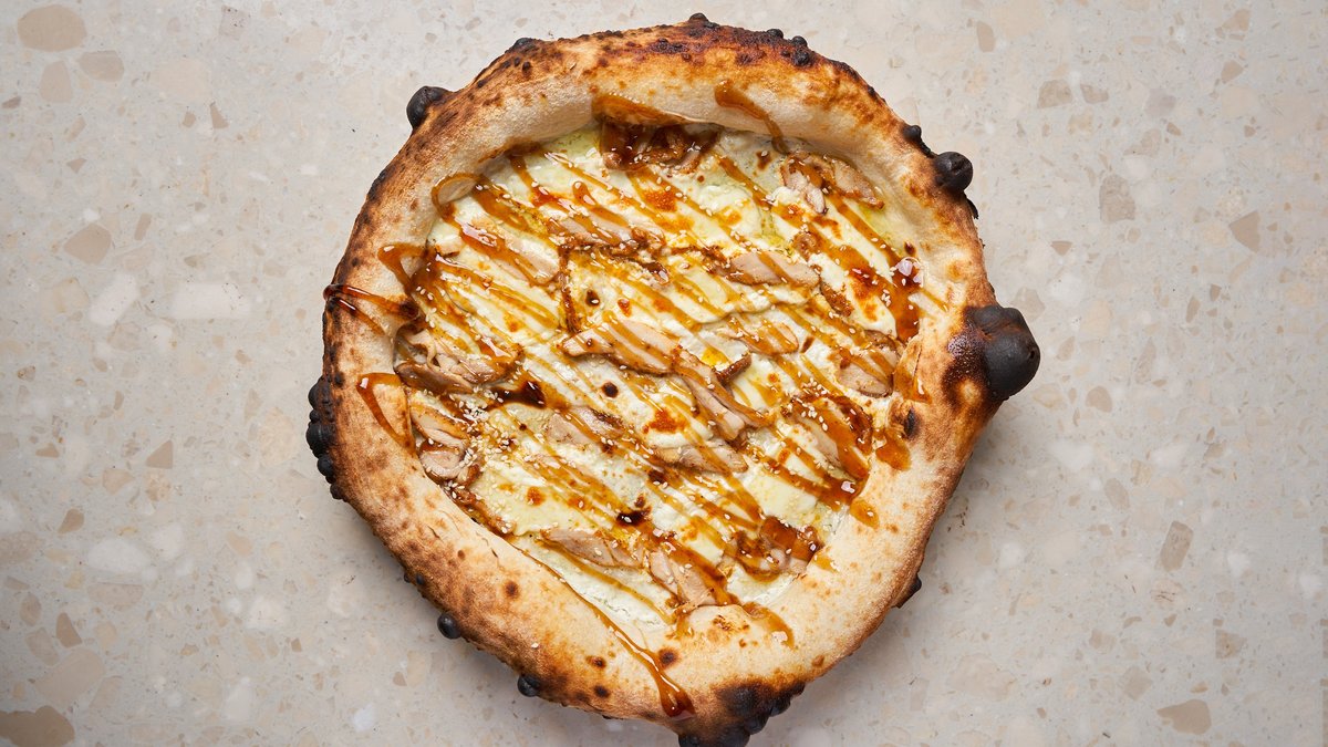 Неаполитанское тесто, сливочный соус, курица, соус Терияки, кунжут, сыр Моццарела
