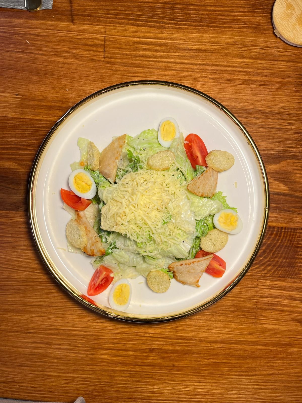 Курица, айсберг, листья салата, сухарики, перепилиной яйцо, черри помидоры, соус цезарь, пармезан